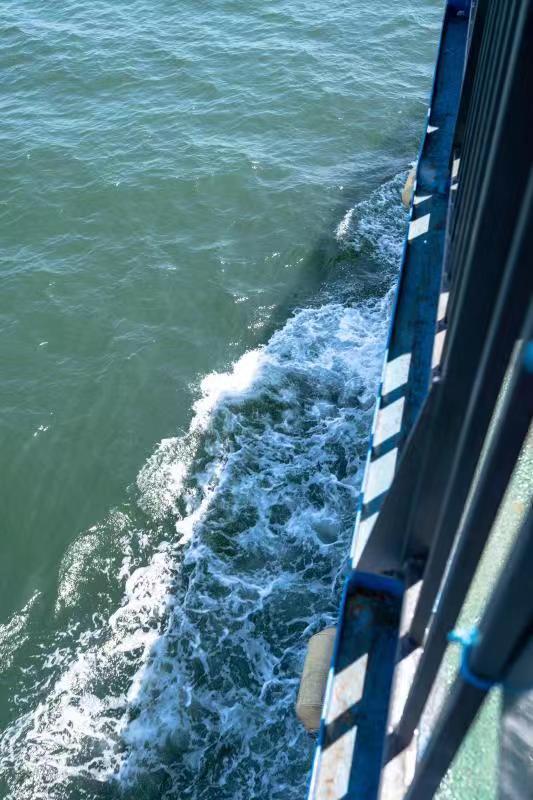 我凭栏而立,看海浪簇拥而至,一下又一下撞到船边,形成朵朵白色浪花,让人切实感受海之美。