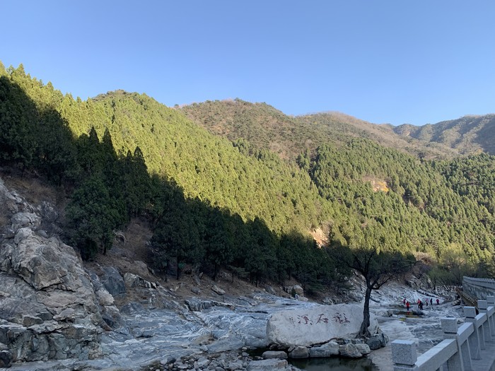然后我就讲讲景色吧。桃花峪游人中心附近有一个免费参观的景点——元君庙,这是泰山女神的西行宫。是唯一一座庙门朝西寺庙。院中还有两棵相对而生的柏树和松树“龙柏凤松”。墙上绘有道教“炁”和八卦图。对道教有兴趣的朋友可以去参观看看,同时梦想成为侠岚和异人的兄弟也可以去看看哦不吃亏不上当说不定伸出你的左手还有奇迹哦。【ps:不可能的,别做梦了,我试过了没有印记。】