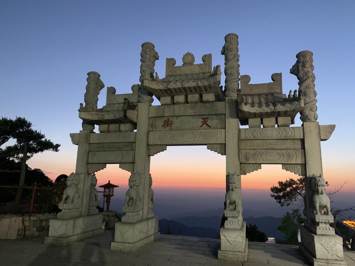从桃花源索道坐缆车到站之后,这边的住宿酒店从外面看基本都是古建筑风格,很有客栈的感觉!比如乾隆行宫的门口就很有韵味,不时有穿汉服的小姐姐驻足拍照。想看日出日落的话可以往山顶玉皇顶方向走,前山话多是庙宇等人文建筑。这次我是走的后山。后山多是自然风景,茂密的树林,幽静的石径小路。从桃花源索道歘出站口出来之后顺着指路标识往前走,往后石坞的那个台阶爬的是真累,也就比十八盘轻松四分之三的台阶吧。不过到顶之后风景是好的,恐高的话建议往里走走,不恐高的话往边上偶尔碰见云海看山中腾云起雾,仿佛进入了大概是人们口中修仙的世界吧。
