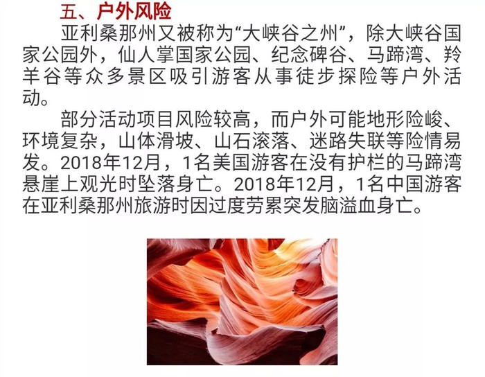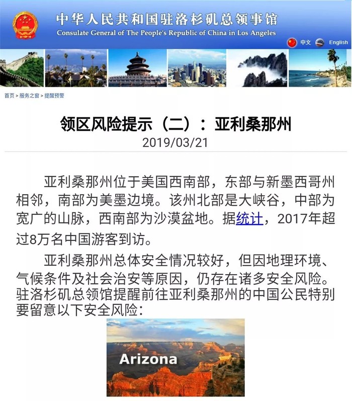 就在事故发生的几天前,中国驻洛杉矶总领馆还特意发布了亚利桑那州的旅行提示,提醒前往亚利桑那州的中国公民要特别留意交通事故、高温炎热以及户外活动风险等。提示说,户外活动因地形险峻、环境复杂,山体滑坡、山石滚落等因素易发险情。