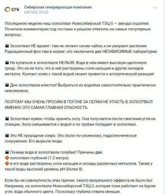 据悉,新西伯利亚发电厂为倾倒垃圾挖出了这片深约1-2米的人工湖。热电厂工作人员费奥多尔·叶夫列莫夫解释说,湖水之所以呈现出美丽的绿松石色,是工厂排出的有毒废料发生了化学反应的结果。