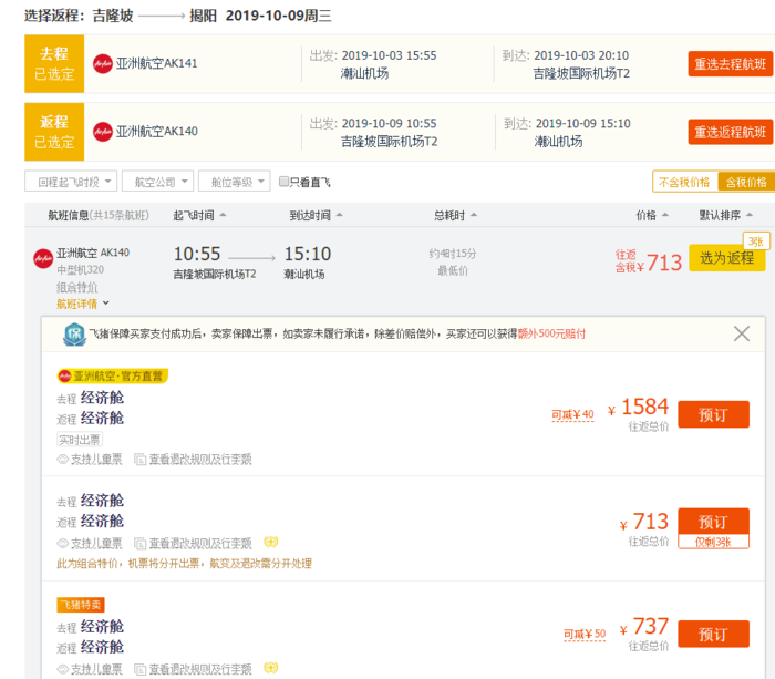 揭阳=吉隆坡,券后含税往返782元,9月29日-10月4日;