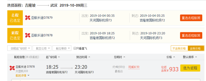 武汉-吉隆坡,券后含税往返883元,10月4日-9日;