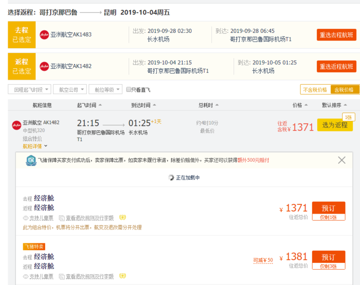 昆明=亚庇,含税往返1.3K,9月28日-10月4日;