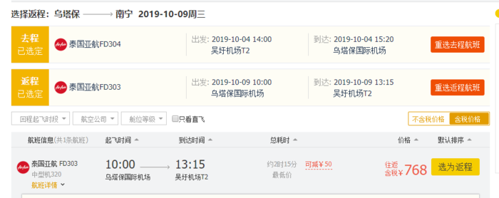 南宁=乌塔保,券后含税往返718元,10月4日-9日;