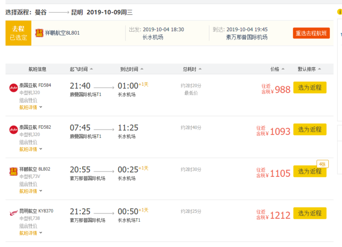 昆明=曼谷,含税往返988元,9月28日-10月4日;