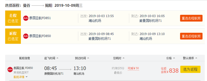 揭阳=曼谷,含税往返580元,9月28日-10月4日;