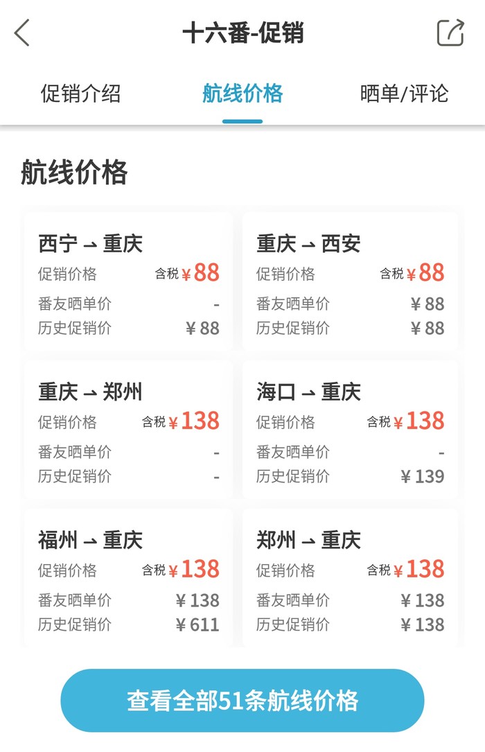和之前出现过的价格对比,本次每条航线基本依然是最低价格,大家升级最新的十六番APP,就能在促销页面看到这个价格对比噢~ 超级方便!