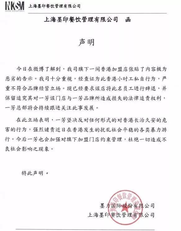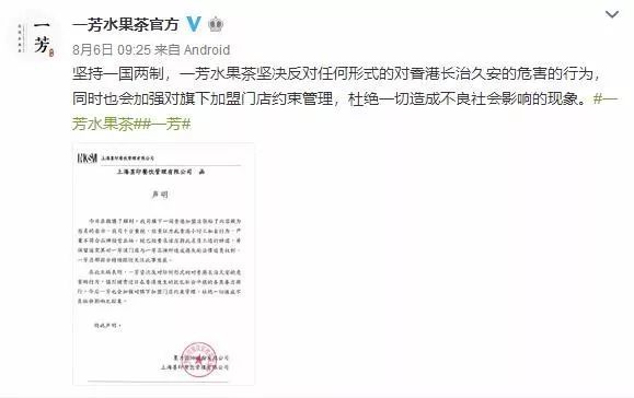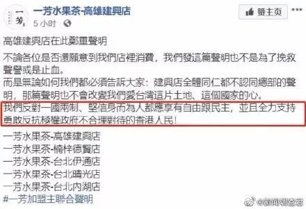 随后,“一芳水果茶官方”在微博发声明,反对暴力和罢工,坚决支持“一国两制”,期待香港繁荣稳定。