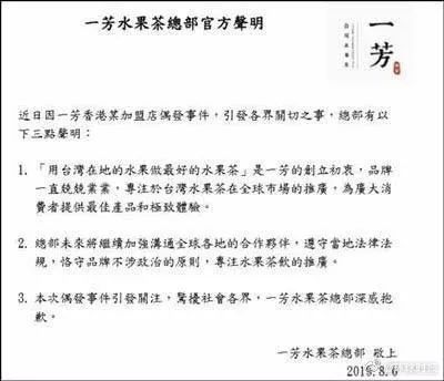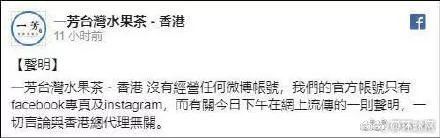 另外,微博公告发布后不久,“一芳台湾水果茶-香港”又在其facebook粉丝团上表示,其官方账号只有facebook及instagram,没有经营任何微博账号,微博的声明、言论与香港总代理无关。