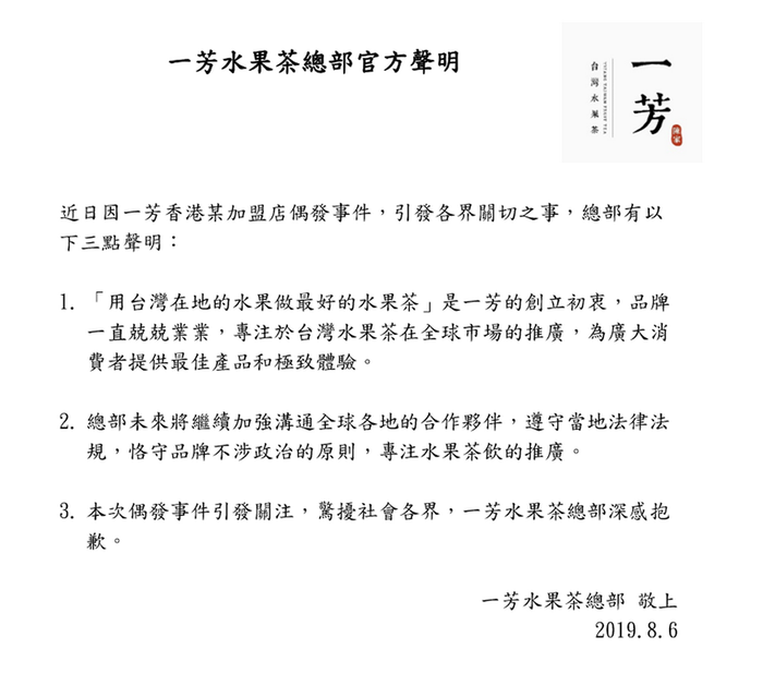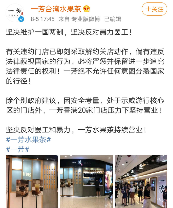 而后在官方微博、微信发文支持一国两制、反对香港罢工,更表示与擅自罢工的一芳加盟店解约。