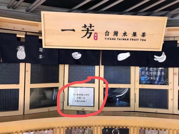 8月5日,香港反对派发起所谓的罢工、罢课、罢市的“三罢”运动,再度导致香港的社会秩序大乱。而就在这天,“一芳”某家香港分店门上的一张公告写着:今天与香港人同行休业一天香港人加油!