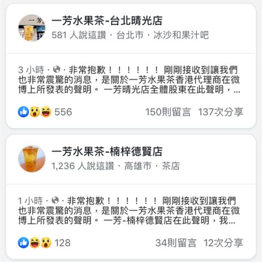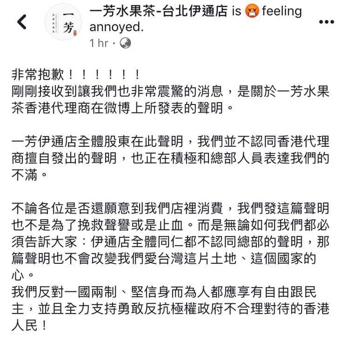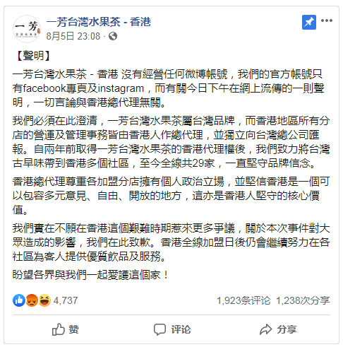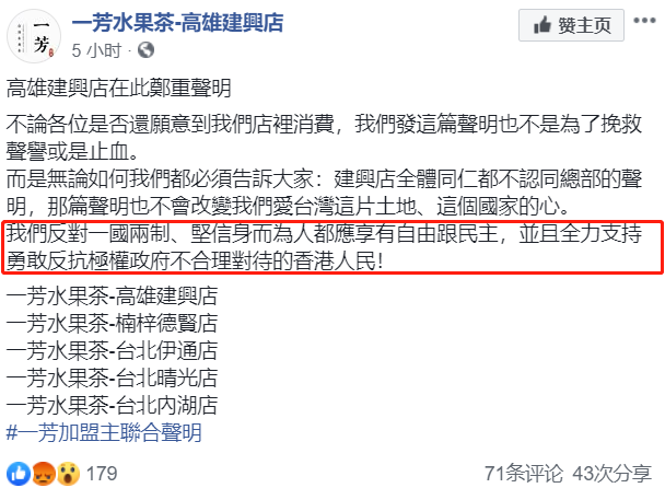 5日晚间,一个名为“一芳水果茶-台北伊通店”的脸书账号却发表了一封与微博上完全相反的声明。在文中,鲜明的表达了自己的政治立场。不过,目前该社交动态疑似已经遭到删除,或是屏蔽,无法查看。