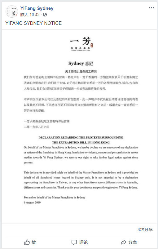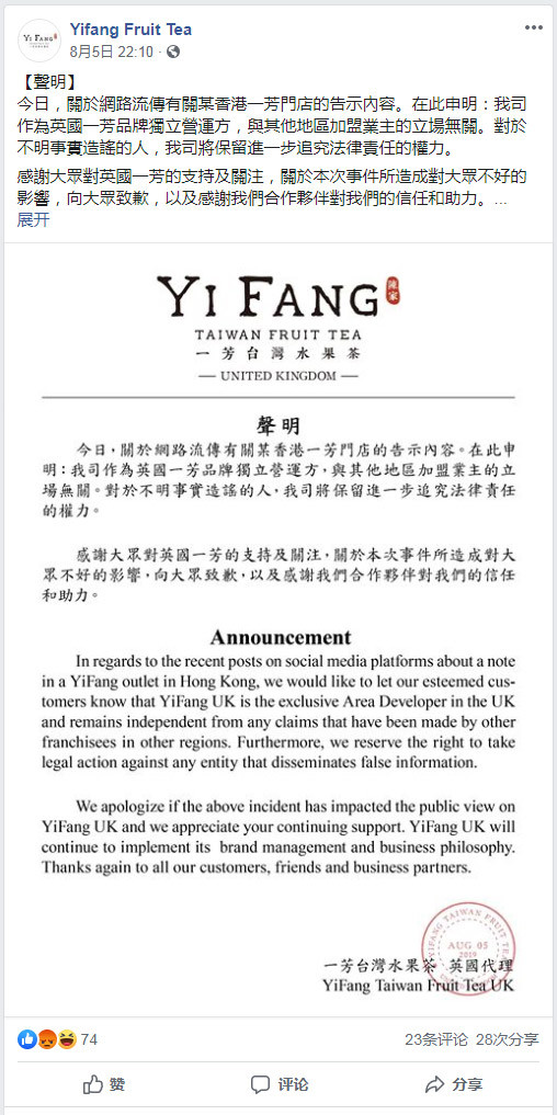 5日晚间,脸书账号@一芳台湾水果茶-香港 发表声明称,微博上的声明与香港总代理无关,香港地区所有分店的运营及管理事务皆由香港人做总代理,并独立向台湾总公司汇报。简而言之,他们的经营与墨力国际股份有限公司、上海墨印餐饮管理有限公司两家公司是并列关系。