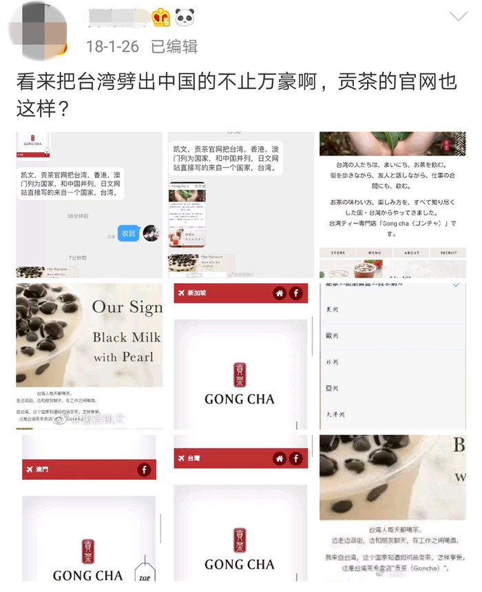 除了“一芳”,还有家奶茶店在去年撞了枪口。知名互联网资讯博主收到网友的投稿,表示台湾贡茶把台湾以及香港,还有澳门分别列为国家,并与中国列为同一选项!