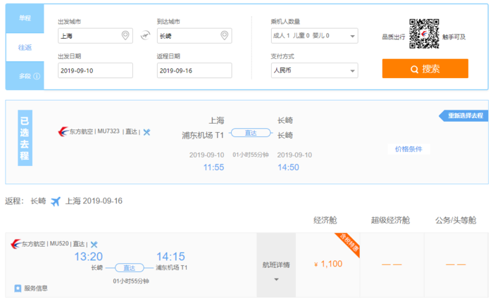 上海浦东—长崎:往返含税1100元,出行时间覆盖中秋假期。