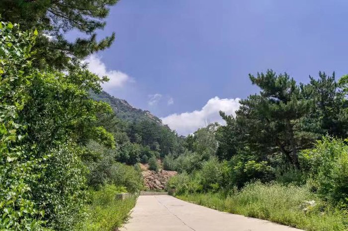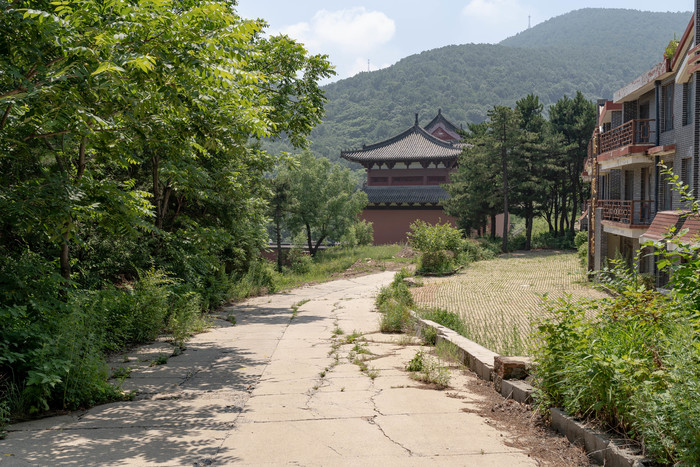 过了假日酒店,通过林间的小道,从远处望去就能看到若隐若现的山海禅寺。