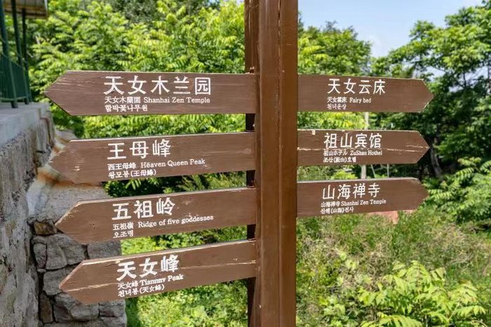 祖山,山势雄伟,群峰林立。海拔千米以上的高峰达二十多座。主峰天女峰,海拔1428米,是秦皇岛港显著的航标。在上天女峰的时候要经过1118级阶梯,到达峰顶的时候可以看到天女的雕像屹立在山峰之上,亭宇之下。