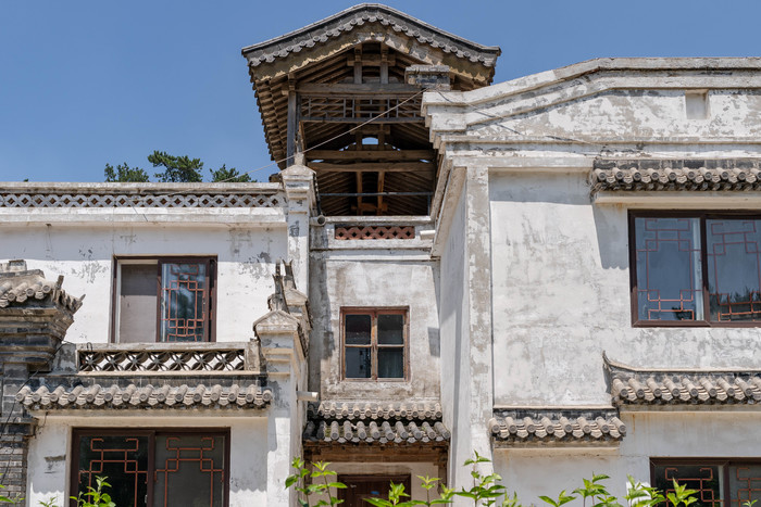 建筑的外墙显得有些陈旧,很有年代感。青瓦白墙是中国传统建筑的经典样式,飞檐翘起的四角、木质的窗、与周围翠绿的植物相得益彰。