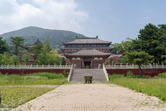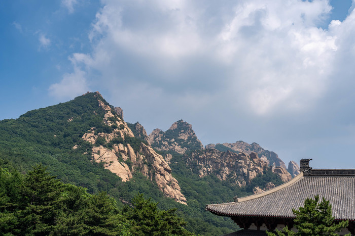 从寺庙抬头向上望去,山峰近在眼前。今天的天很蓝,山很绿,阳光正好。