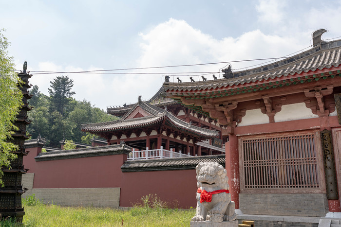 寺庙门前一对石狮子,摆放在正门两侧,造型乖巧可爱,富有灵性。石狮为雌雄一对,雄狮张口注视来往信众常。门楼墙壁有精致的雕花,屋顶的雕花更为精致美丽。