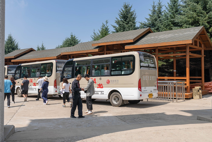 从山海禅寺出来,离天女峰还有很长的一段距离,许多中巴车在这里等候登山的行人。坐上中巴车可以直接到达北天门。班车经过盘山路,有许多陡峭的弯,山路又陡又险,一路颠簸。