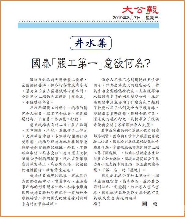 而且,国泰航空旗下约3000员工随后还参与乱港派8月5日发起所谓“三罢”行动,导致大量旅客及外游港人滞留香港机场。