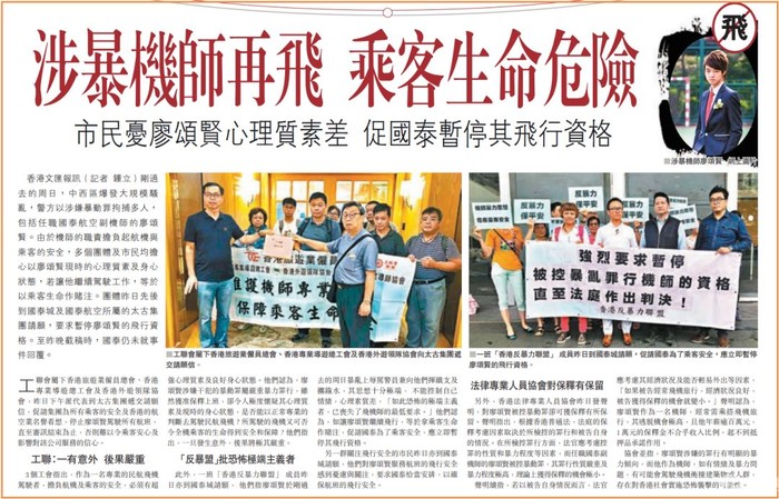 此前,国泰航空对相关涉事人员的态度可谓相当包庇,国泰航空副机师廖颂贤涉嫌在7月28日参与中上环冲突暴力袭警后被控暴动罪,获法庭批准保释,并可在当值期间离港工作。因应公众担心廖会与政见不同的乘客有矛盾,可能危害航班安全,媒体多次查询国泰航空,国泰均以保障私隐为由拒绝回应,相关代表和民众要求国泰停飞该飞行员,国泰也拒绝回应。
