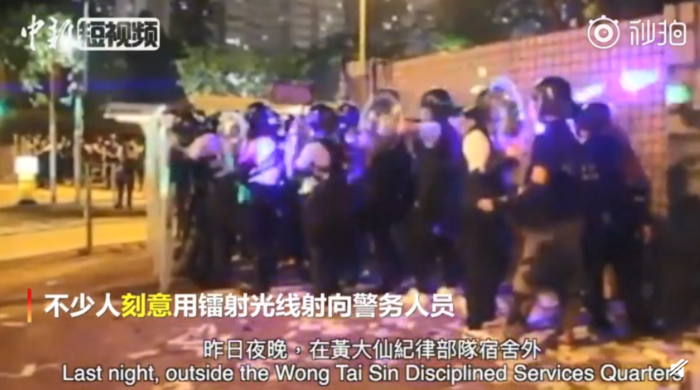 @人民日报:香港警方在其社交网站指出,9日晚在黄大仙有人刻意用镭射光照射警员,阻碍他们执行职务,其中有三名警员眼部肿痛、出现血丝,之后需送院治理。香港警方表示,近期以来共有九名警员被镭射光所伤。