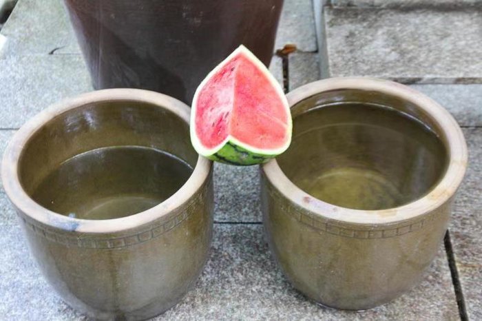 酷热的夏天,山路一旁摆着盛满山泉水的大缸,浸泡的西瓜格外清甜。炎炎夏日,是再好不过的解暑办法了。