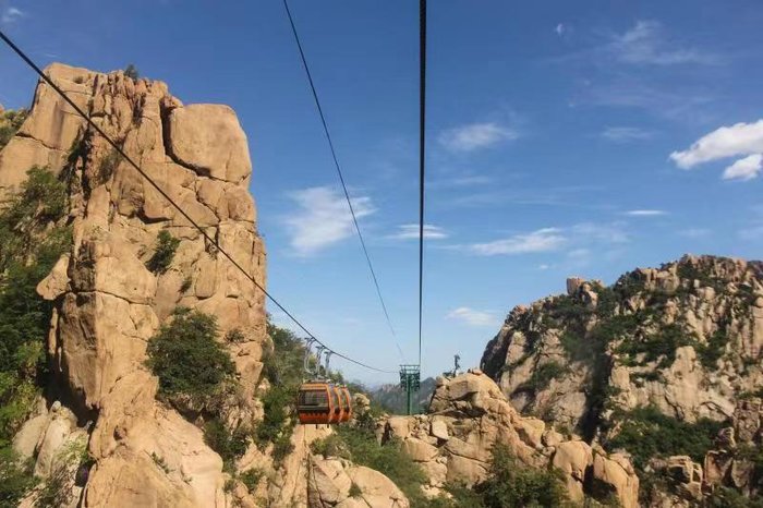 参观完幽谷禅堂,往前走一小段路,便可以坐索道前往山海禅寺,碰巧的是与刚才的老大爷相遇。缆车上俯视全山,青山绿水、奇峰怪石美得让人移不开眼睛。