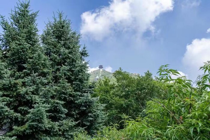 从山海禅寺离开后,坐上观光车前往天女峰。司机说,对面山顶的小亭子就是天女峰峰顶。