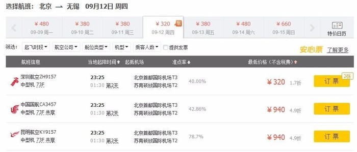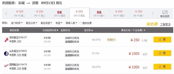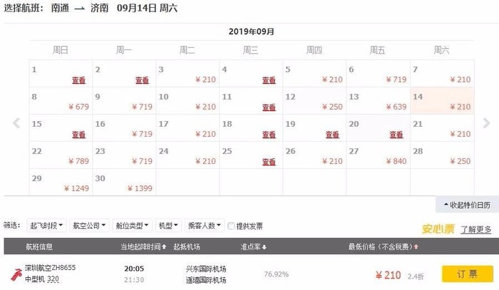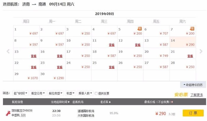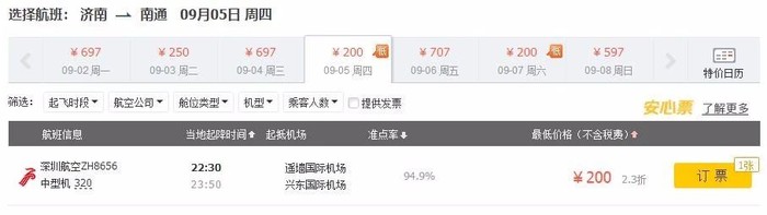 济南-南通,单程含税250元;中秋票贵一些,含税340元;