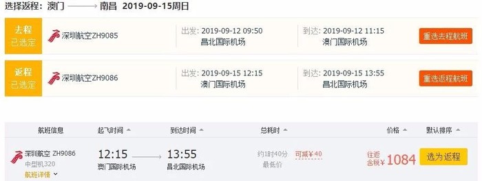 南昌=澳门,券后含税往返1044元,中秋期间,9月12日-15日;