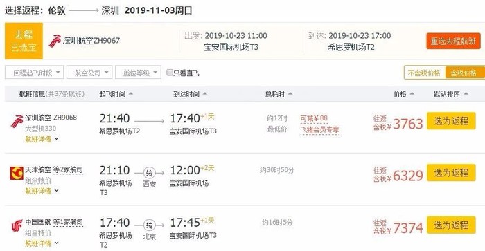 深圳=伦敦,券后含税往返3.6K(飞猪可减88元,这条航线同期深航最便宜);