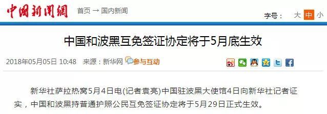 去年5月29日,中国和波黑持普通护照公民互免签证协定正式生效。根据协定,中波两国持普通护照公民在对方国家入境、出境、停留或者过境,每180日停留最长不超过90日,免办签证。