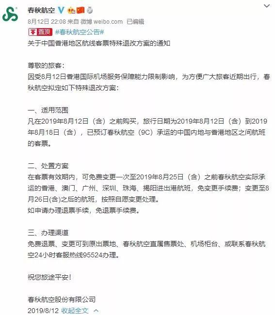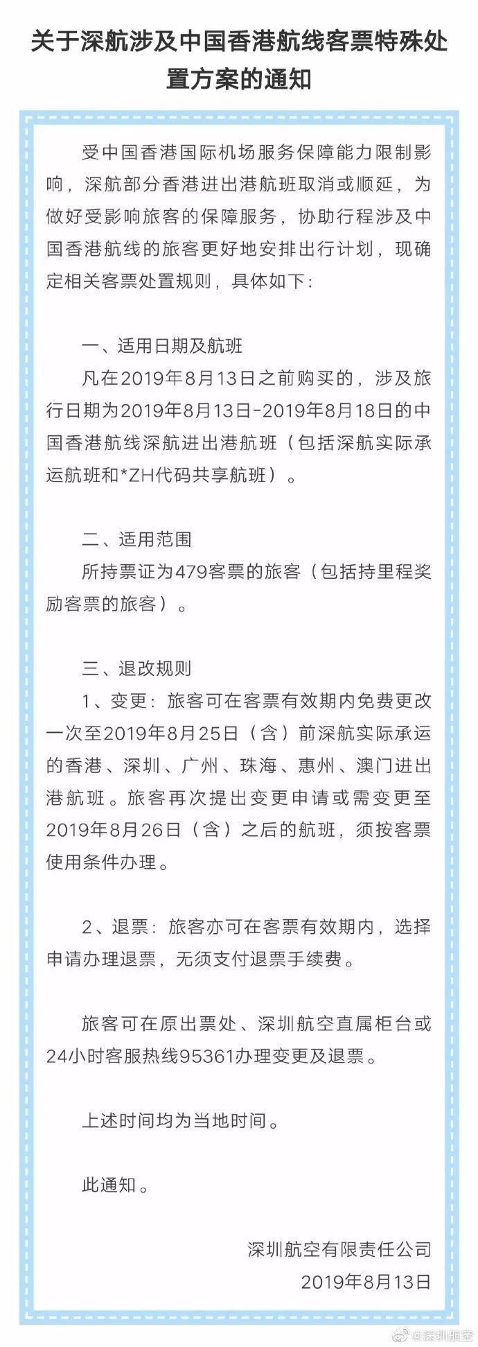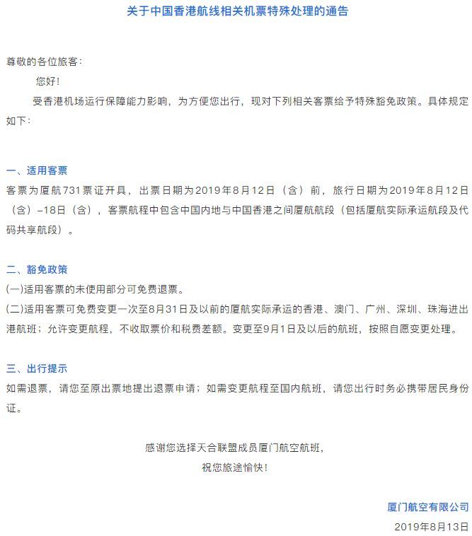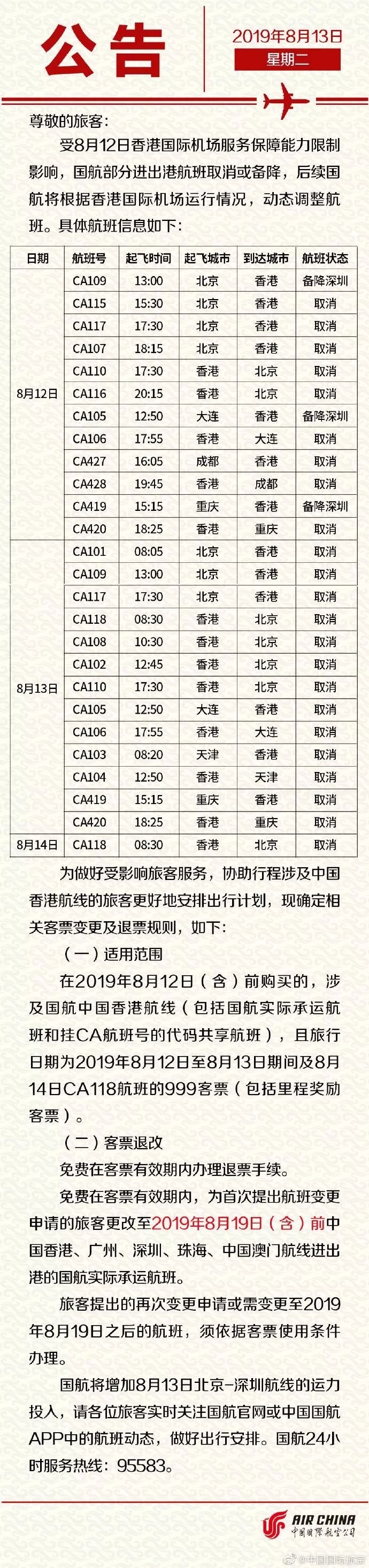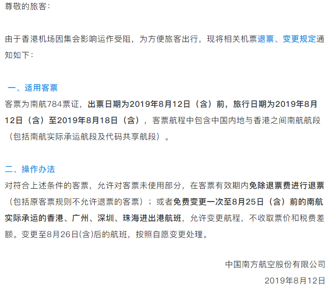 ①适用客票,在8月12日(含)之前出票或购票;②费用方面,改签免手续费。其中,川航和春秋航空特别指出,退票免手续费也包括原规则不允许退票的客票。③航班调整方面,国航后续将根据香港国际机场运行情况,动态调整航班。