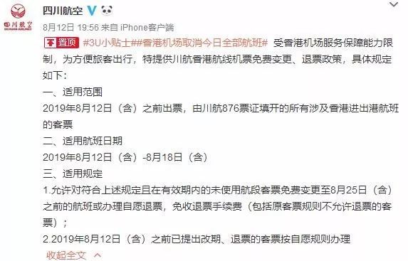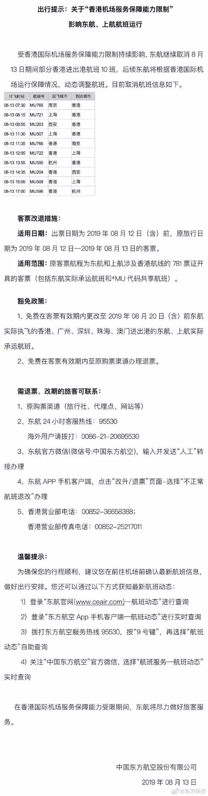 针对香港机场因集会影响运作受阻事件,目前,东航、国航、南航、川航、深航、春秋航空、厦航已发出机票退票、变更公告:
