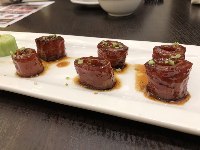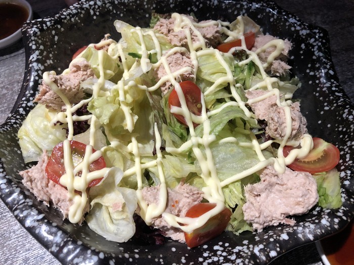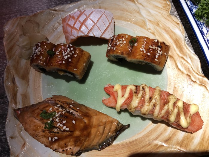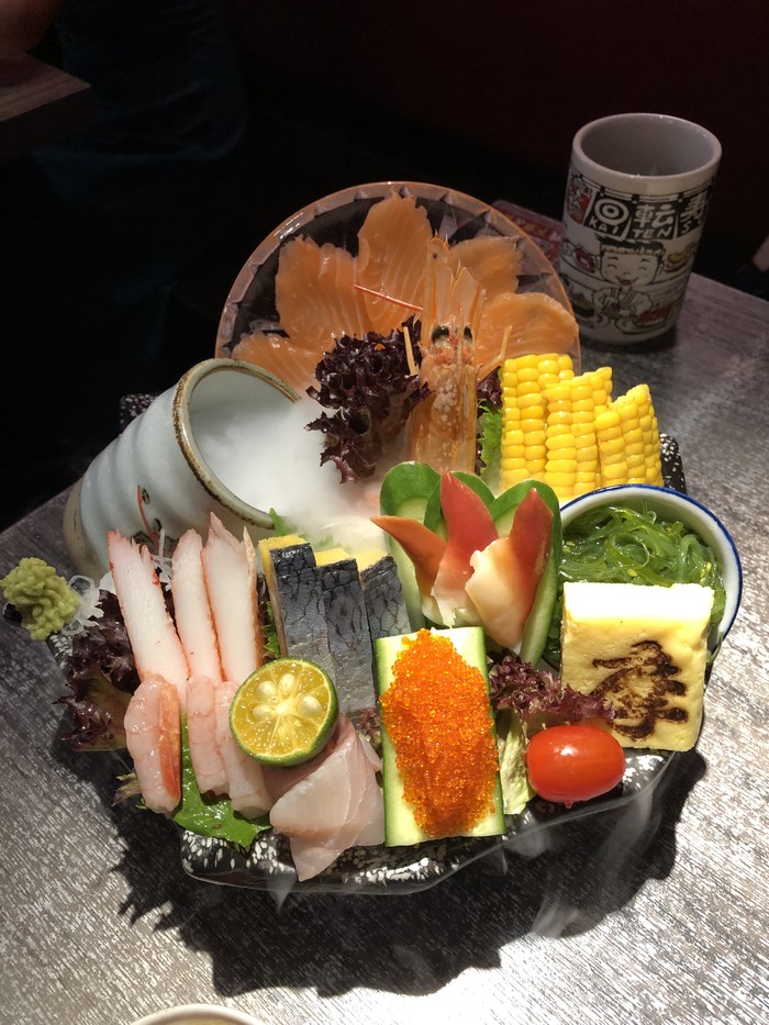 看见没,鱼生有三盘,吃完一盘拿一盘,我和叶子君没吃完,旁边有个大哥点的和我们一样,他全吃了,我俩瞬间服气。这顿一共138,相当划算了。