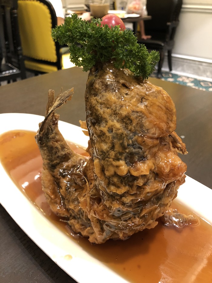 糖醋鲤鱼 这个鱼是镇店之宝,不过又腥又软,太难吃了,基本整条都剩下了
