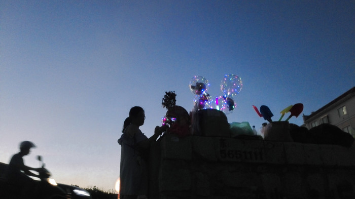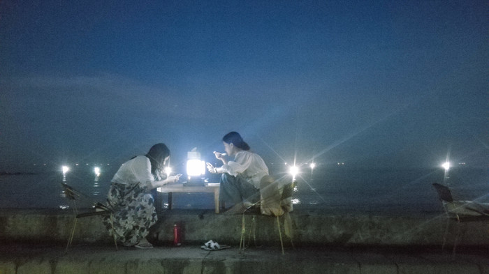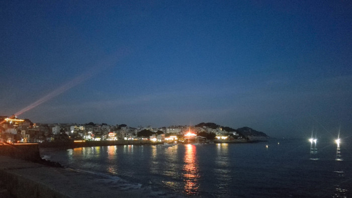 夜晚南门湾的海才热闹起来,白天消失的人夜里都到海滩上来玩,还有店家在海堤上摆了桌子,卖了茶水,好不惬意啊。