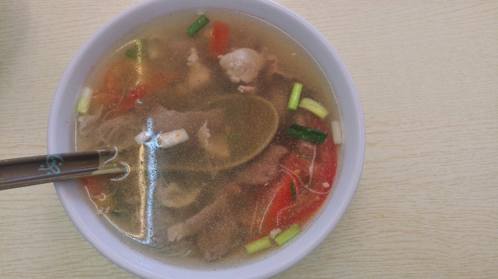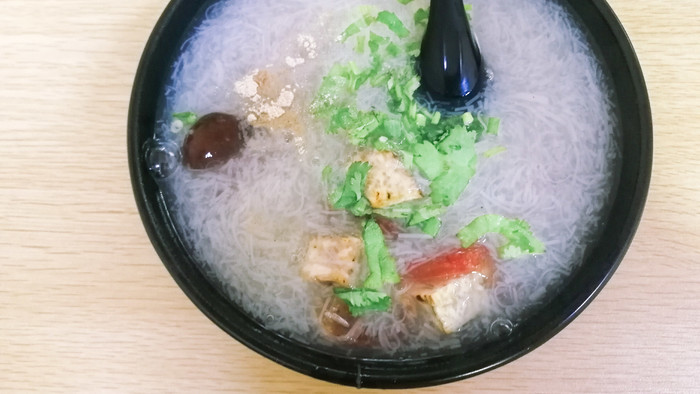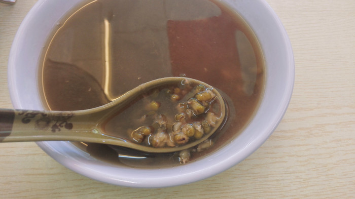 喝一杯冰绿豆汤,颗粒分明,清凉入骨,5块钱一杯倒是有点贵,配一碗猪肝肉丝粉。感觉自己喝了两碗汤。
