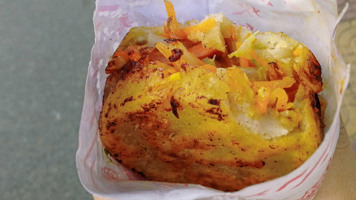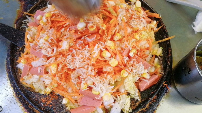 街头这个饼我不知道叫什么,在团结路和去南门湾交叉的一个路口,很小的一个摊位,里面夹了鸡蛋玉米胡萝卜火腿肠之类的,5块钱一个,去早去晚都买不到,倒是想再去吃,去了两次都没碰到。