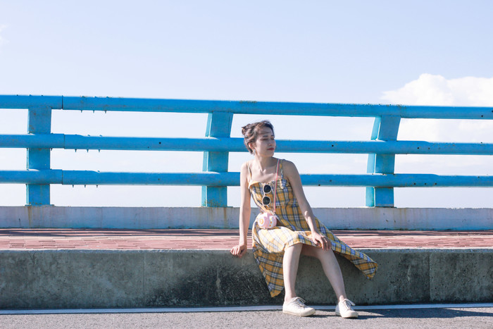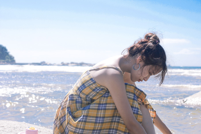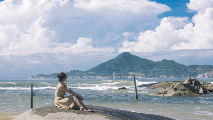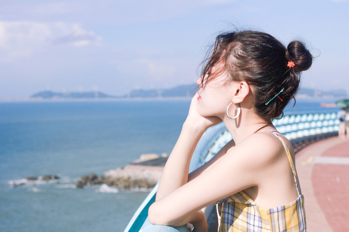 那么这个小姐姐呢,漂亮的穿着似乎也并不是一个人,可是身边却没有其他人的影子,是不是跟男朋友吵架所以一个人出来散散心呢,小姐姐只是呆呆的看着大海,一动不动地想着自己的心事。