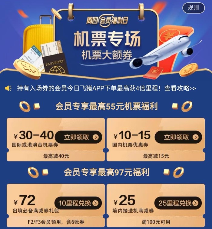领取页面:飞猪APP首页顶部会员福利日广告图 - 机票专场