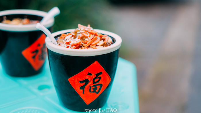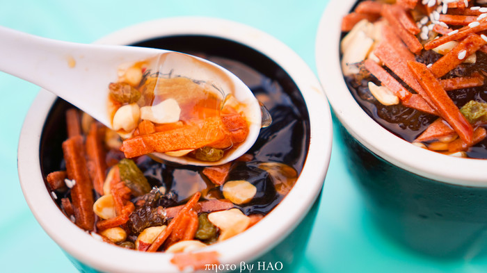 排队的时候,先行品尝了一下店里的招牌冰粉。装在特色的小瓦罐里十分的喜庆,山楂,花生,葡萄干搭配上白芝麻,和红糖冰粉搅动在一起后的奇妙口感让排队的烦闷顿时消解一大半。