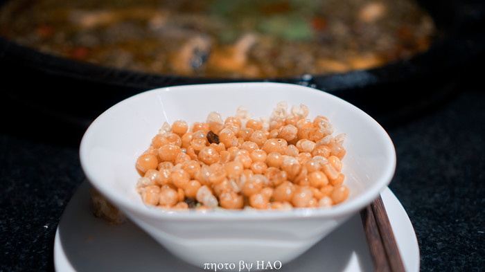 吃鱼火锅肯定是选择原汤碟,大院河鲜的原汤碟里铺满了脆脆的黄豌豆,打上一勺原汤,双重口感在舌尖绽放。