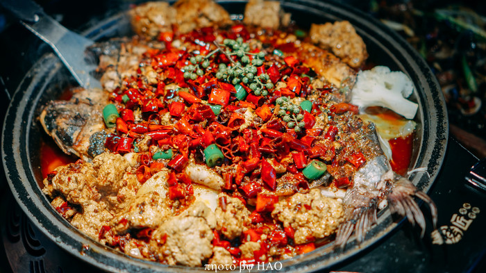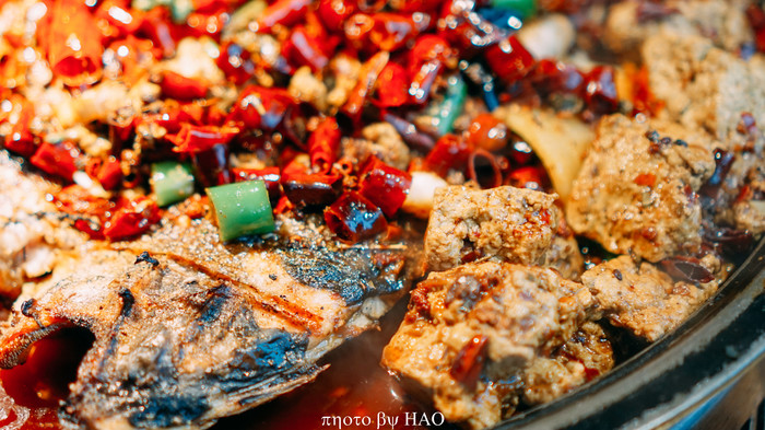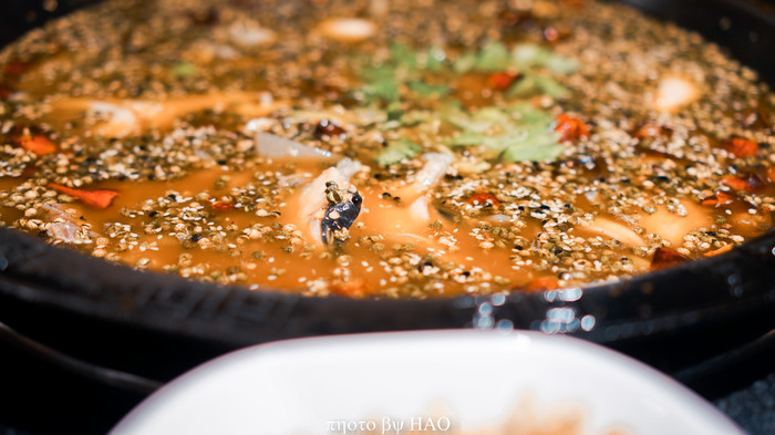 终于,经典的招牌麻辣烤鱼算上桌了。一掀开盖子就是火热的红映入眼帘和热辣的香扑面而来。烤盘下的小火持续加温,汤汁渐渐冒出咕噜咕噜的声音。