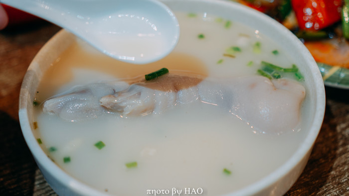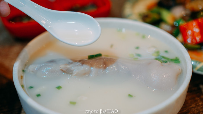 招牌的老妈蹄花肯定是必点的。一个大碗里装着整只猪蹄泡在雪白的浓汤里。猪蹄已 被炖的软烂,轻轻一抿就脱骨。胶原蛋白在唇齿间流连,感觉自己越吃越年轻,皮肤越吃越好。