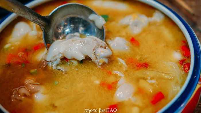 除了清淡养人的白汤蹄花,这里还有偏泡椒和野山椒风味的酸辣蹄花可以选择。蹄花已经被分成小块,炖到软烂皮肉分离,建议用勺子捞蹄花,一口下去酸辣可口。